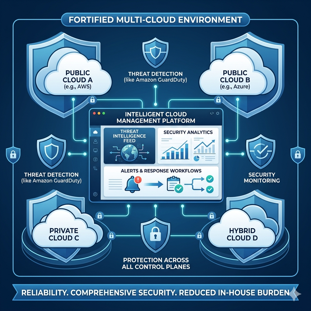 Our Intelligent Cloud Management platform unifies threat intelligence, security analytics, real-time alerts, and automated response capabilities into a single, easily deployable solution. Designed for multi-cloud environments, it seamlessly integrates with leading cloud platforms and supports cloud-native security services such as Amazon GuardDuty, enabling proactive threat detection and efficient incident management.